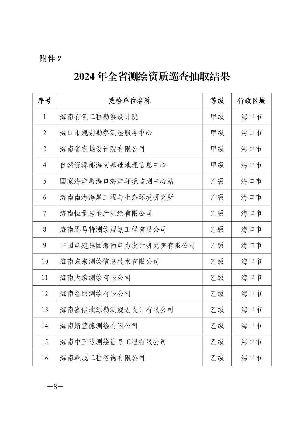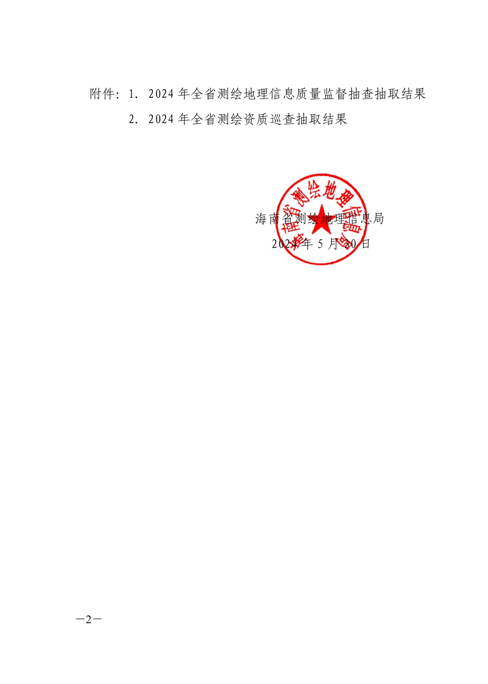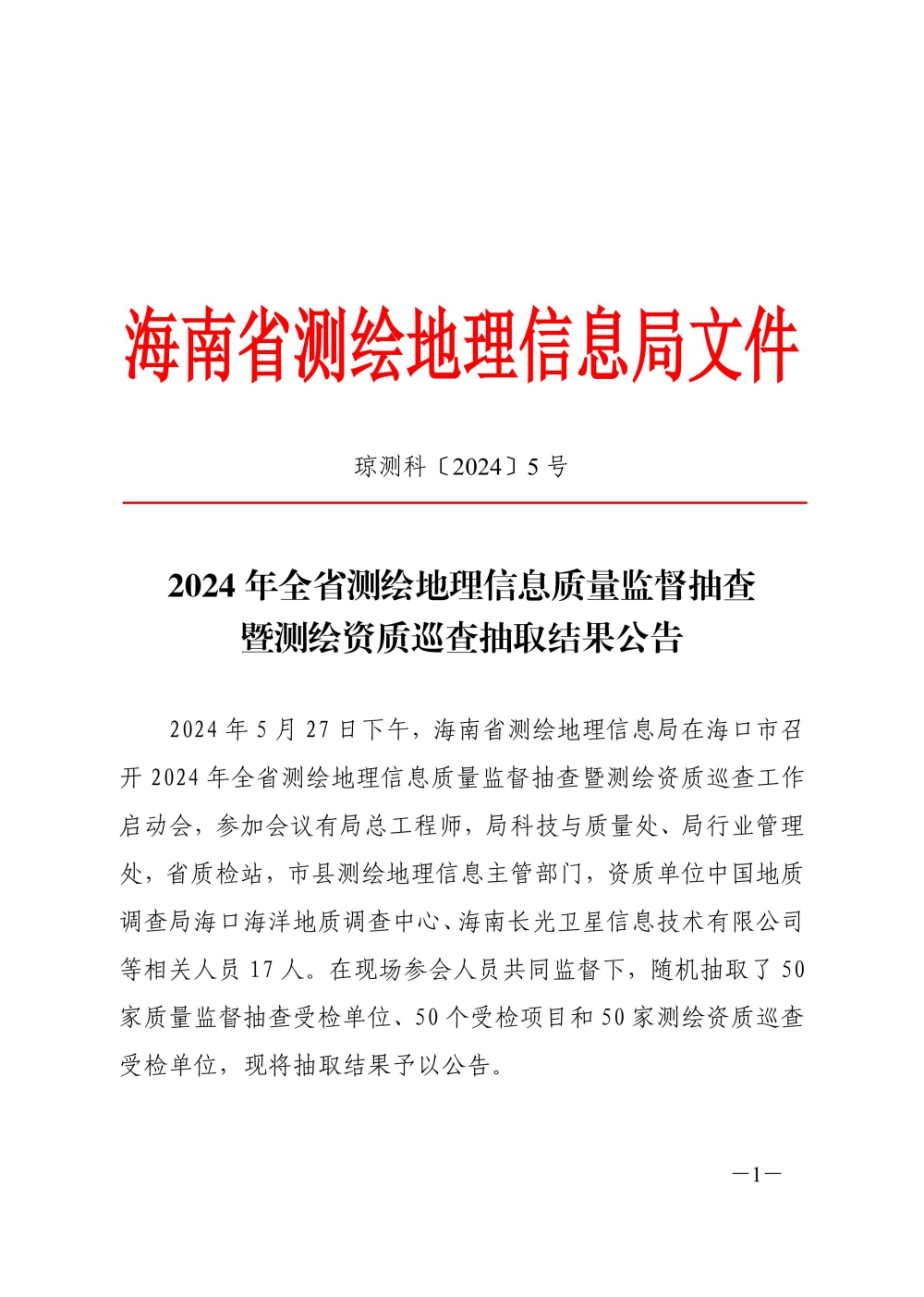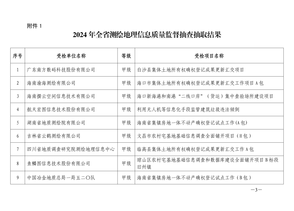 2024 年全省测绘地理信息质量监督抽查 暨测绘资质巡查抽取结果公告